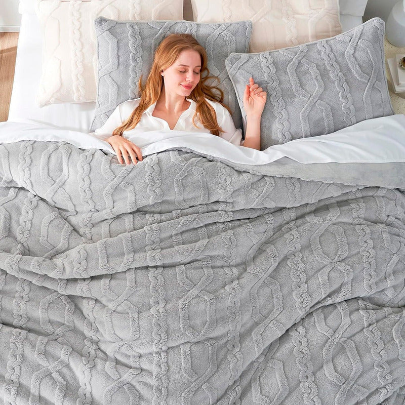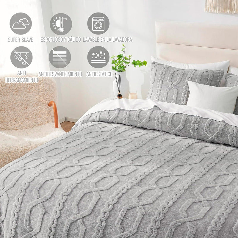 Súper suave y cálido, con forro polar sherpa esponjoso de 300 GSM, este juego de edredón es ultra suave en ambos lados. El peso de la tela seleccionado te proporciona una experiencia acogedora y cálida en las frías noches de invierno sin causar sobrecalentamiento.