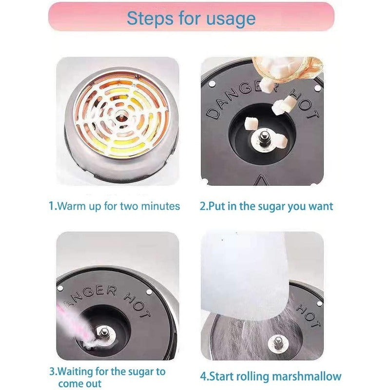 Maquina fácil de usar, solo debe enciende la energía, espera unos minutos para calentar, verter el azúcar y luego girar el malvavisco al principio. hacer fácilmente malvaviscos en 3 minutos usted puede hacer un caramelo de algodón de unos 10-15cm de espesor. Es desmontable, utilizando material especial de teflón, no pegajoso y fácil de limpiar.