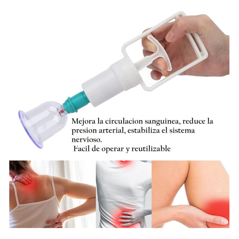 Este producto es un tipo de dispositivo que se utiliza para aplicar ventosas y raspar en la atención médica y tratamiento clínico. La terapia de ventosas se considera como una manera de abrir los 'meridianos' del cuerpo. Mejora la inmunidad y la función muscular.