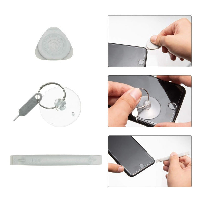 - 16 otros accesorios necesarios para destornillador (1 funda hexagonal, 1 eje de extensión duro, 1 eje de extensión suave, 1 pinzas, 3 spudgers de plástico, 6 herramientas de palanca triangular, 1 ventosa, 1 herramienta de expulsión de tarjeta SIM, 1 magnetizador/desmagnetizador).