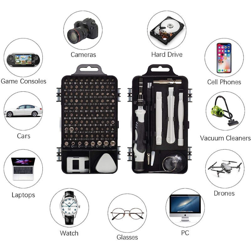 El kit de destornilladores pequeños de precisión 115 en 1 se puede utilizar para reparar la mayoría de los electrodomésticos, tales como televisores, aire acondicionado, ventiladores, refrigeradores, reparación de coches, reparación de ordenadores portátiles, teléfonos móviles, cámaras digitales, relojes, consolas de juegos y otros dispositivos electrónicos.