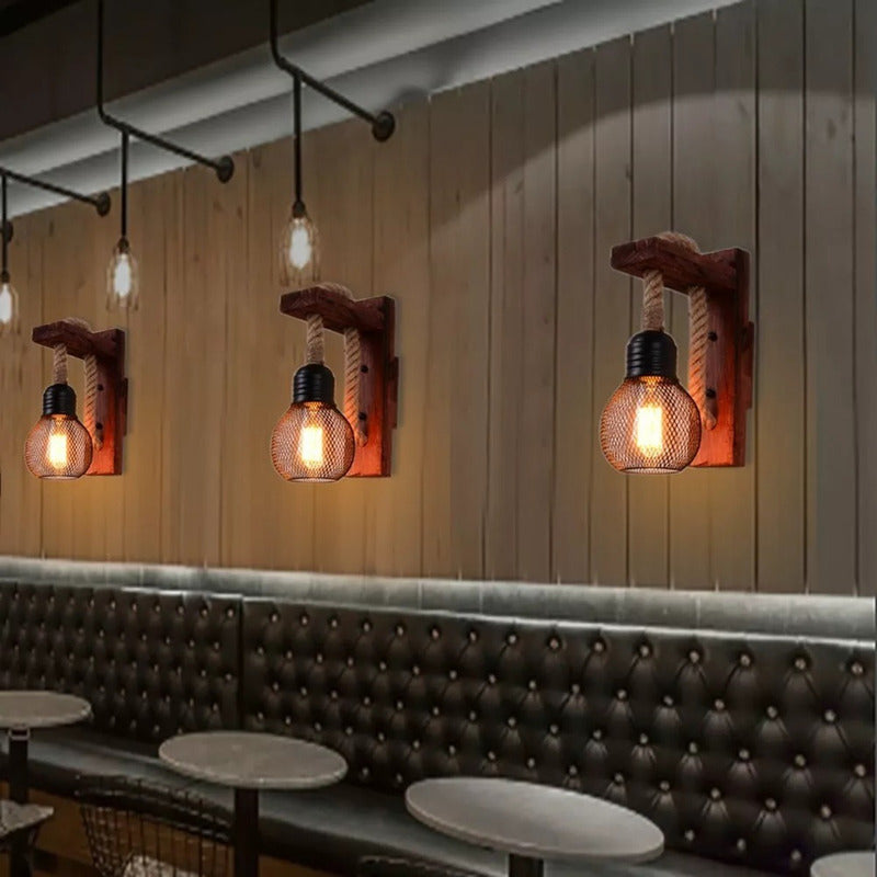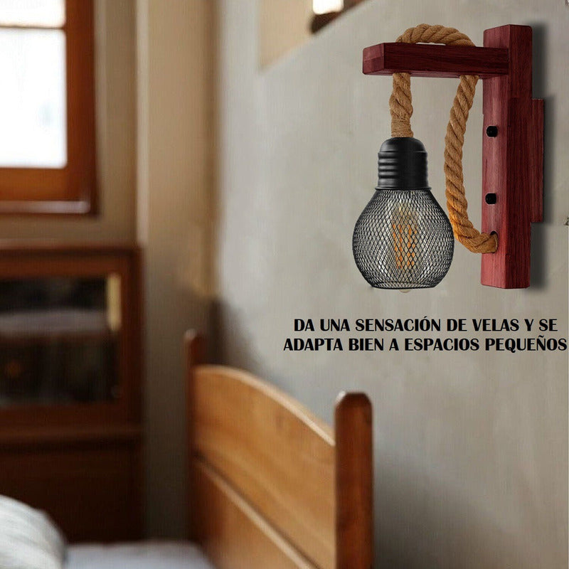 Lámpara de pared de madera retro hecha con puntales de madera maciza de alta calidad y decoración de cuerda de cáñamo, color marrón rojizo.