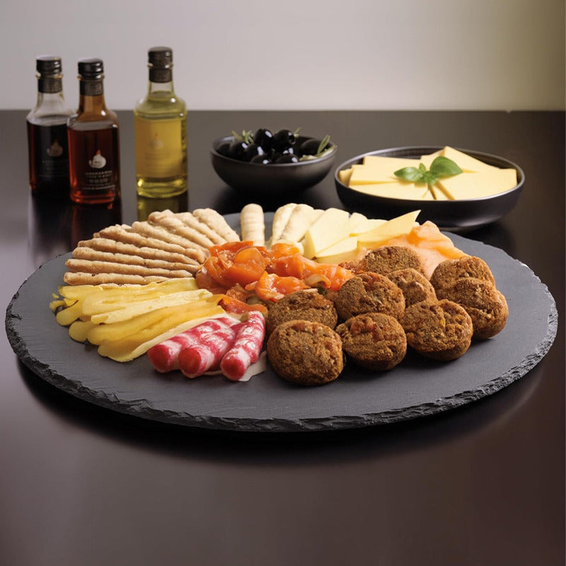 Elegante y lujosa, nuestra placa giratoria redonda está hecha de pizarra oscura/negra de alta calidad. Con un diámetro de 33 cm y rotación de 360 grados, la placa es funcional y versátil.