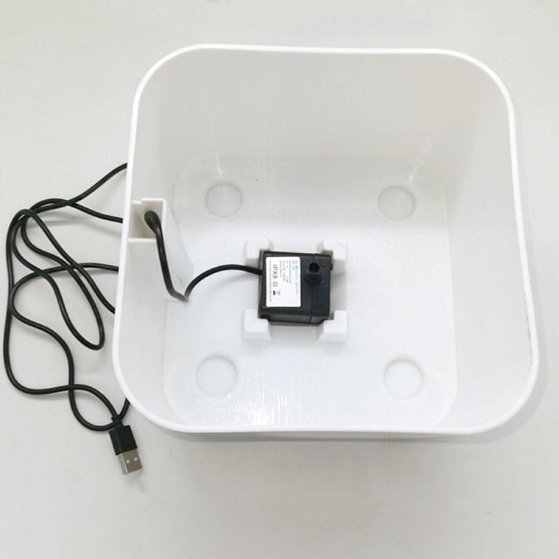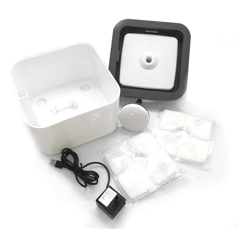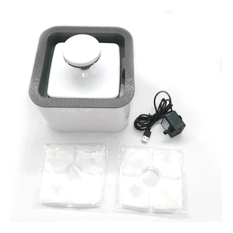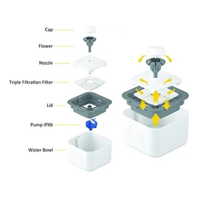 Incluye un sistema de filtración triple con algodón, que elimina las impurezas, escombros y olores del agua. Cuenta con una bomba de agua silenciosa incorporada, de bajo consumo energético y resistencia al agua ipx8. Se recomienda limpiar la bomba al menos cada dos semanas.