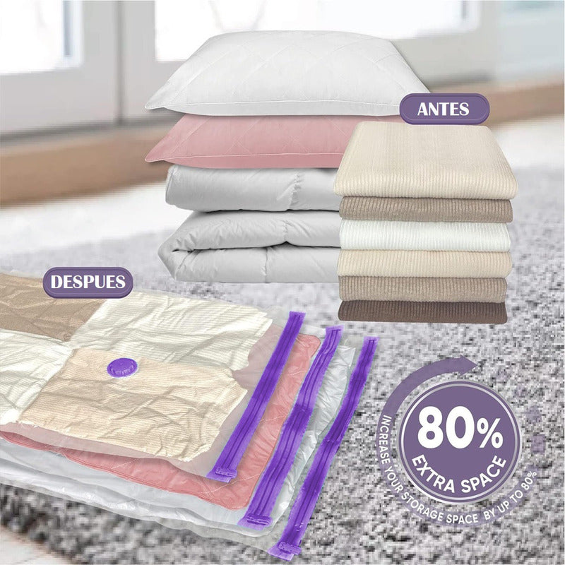 Haz espacio en tu closet y guarda tu ropa de una temporada a otra. Las bolsas Economizadoras de espacio traen incorporada una válvula estándar que se adecua al tubo de succión de tu aspiradora, la que hará el trabajo de extraer el aire al interior de la bolsa, dejándola comprimida. Guarda Toda tu Ropa en Forma Ordenada. Tamaño Ideal para el Closet y las Maletas.