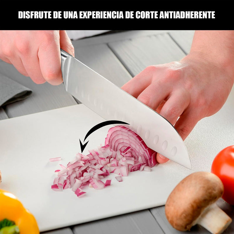 priorizando tu comodidad y seguridad, nuestro cuchillo santoku está diseñado por expertos con ergonomía, con un mango de espiga completa que se adapta perfectamente a tu agarre
