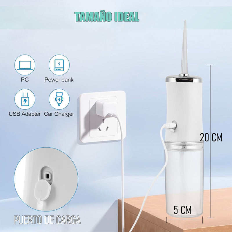 ¡Mantén tu salud bucal en óptimas condiciones estés donde estés con nuestro Irrigador Bucal Portátil! Con un encantador diseño resistente al agua, este dispositivo te ofrece la libertad de cuidar tu sonrisa en cualquier momento y lugar. Con un vaso de 220 ml integrado para mayor comodidad y una boquilla que gira 360 grados, garantiza una limpieza eficaz y completa.