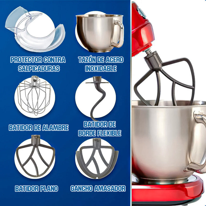 Incluye los siguientes accesorios: batidor plano, batidor de alambre, gancho amasador, batidor de borde flexible y protector contra salpicaduras