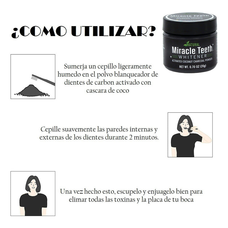 Recomendaciones para la aplicación: Introduzca su cepillo de dientes en el polvo de dientes de carbón, luego debe cepillarse como si fuese pasta de dientes y enjuague.