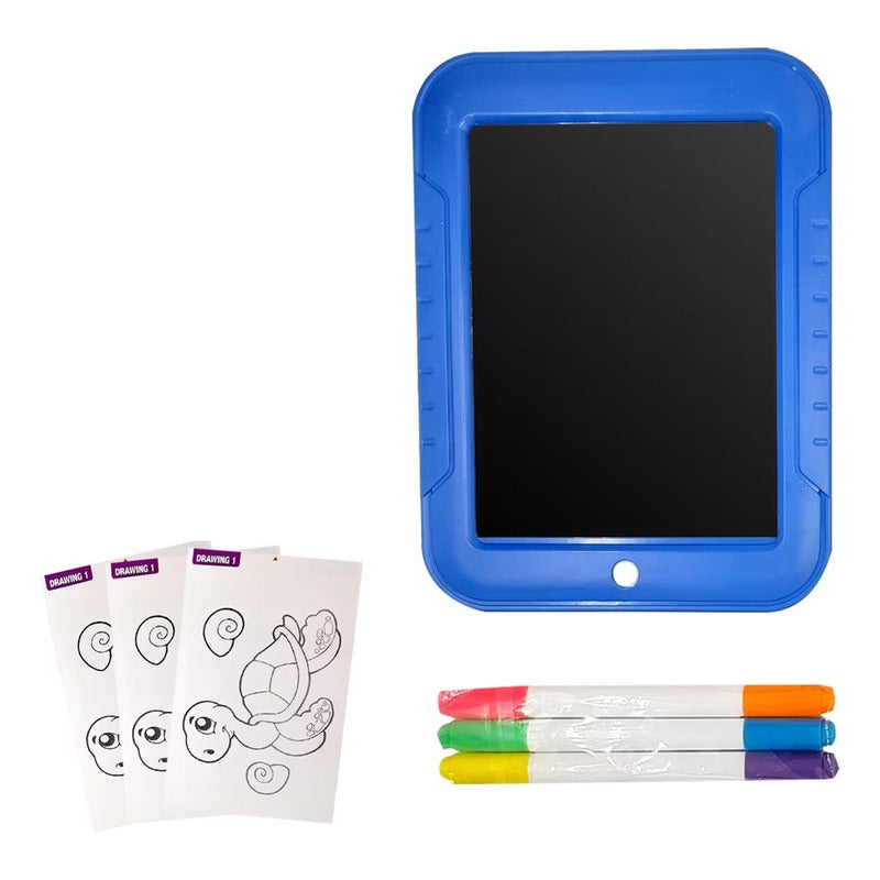 Eleva la creatividad de tu hijo con esta magnifica pizarra magica, cuenta con variedad de dibujos para colorear con marcadores especiales, al colocar las pilas y encenderla podrás ver el gran juego de colores dispuestos por ti en cada dibujo.