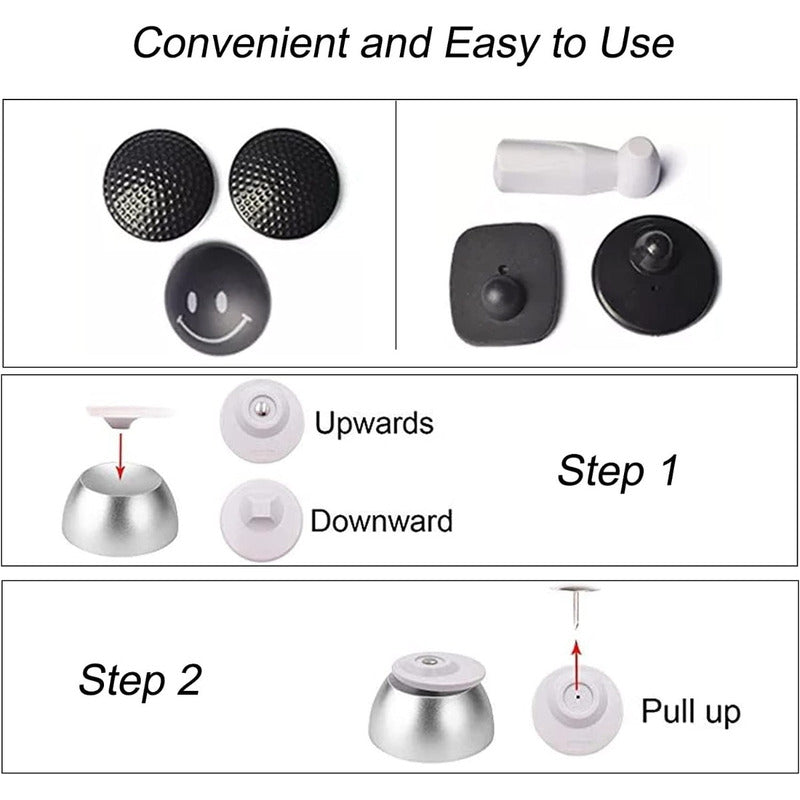 Simplemente inserte el pasador incluido en la ropa y empújelo hacia el orificio interior de la etiqueta de seguridad. Luego, el pasador de cabeza plana encajará firmemente con sus etiquetas. La fácil extracción con nuestro separador de liberación magnética le ahorra mucho tiempo y esfuerzo.