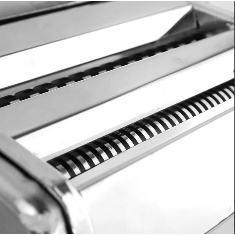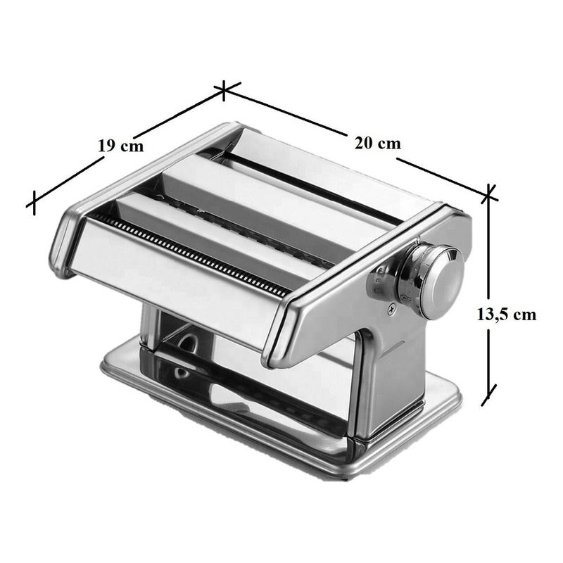 Esta es una máquina manual diseñada para la elaboración de Fideos-Tallarines. Te permite disfrutar de una auténtica comida italiana en la comodidad de tu hogar. Funciona de forma manual con una manija que gira los rodillos cortantes a 1,5 cm aproximadamente para cada fideo, permitiéndote cortar la masa a la medida para hacerla pasar por los rodillos. Esta máquina tiene la capacidad de realizar 42 fideos por vez.