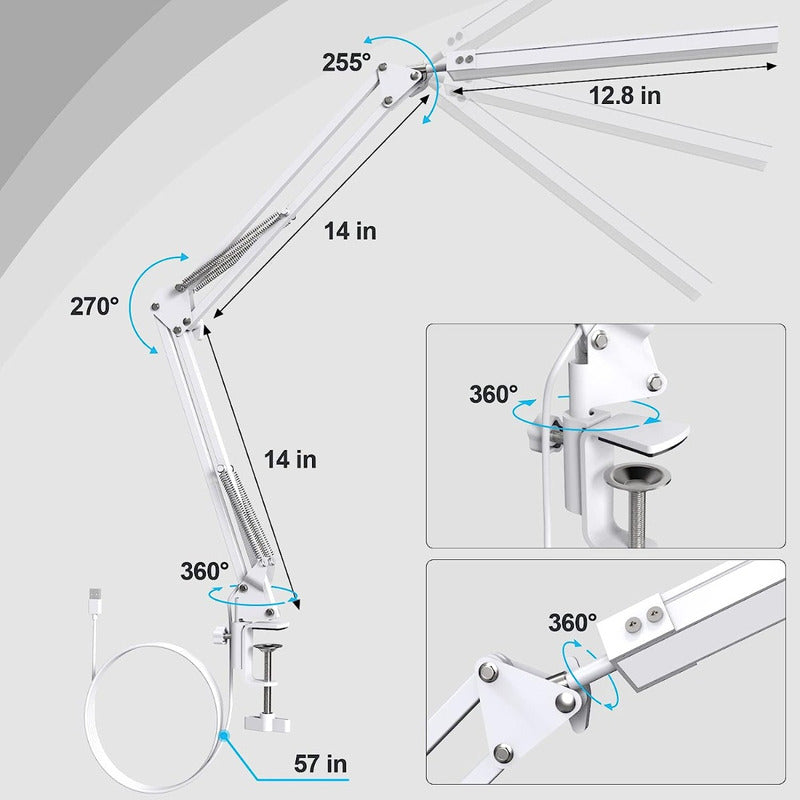 Lámpara giratoria de 360°, base giratoria de 225°, brazo de metal ajustable de 270°, ángulos ajustables y múltiples posiciones, puedes ajustar la dirección de la luz de acuerdo a tus necesidades personales.