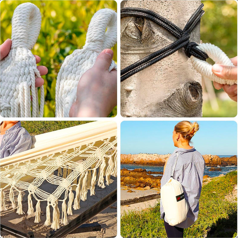 El lazo de cuerda en ambos extremos de la hamaca doble está tejido a mano con 15 cuerdas gruesas y 2 cuerdas cada grupo. La capacidad máxima de peso alcanza 100kg, por lo que es súper segura y confiable.