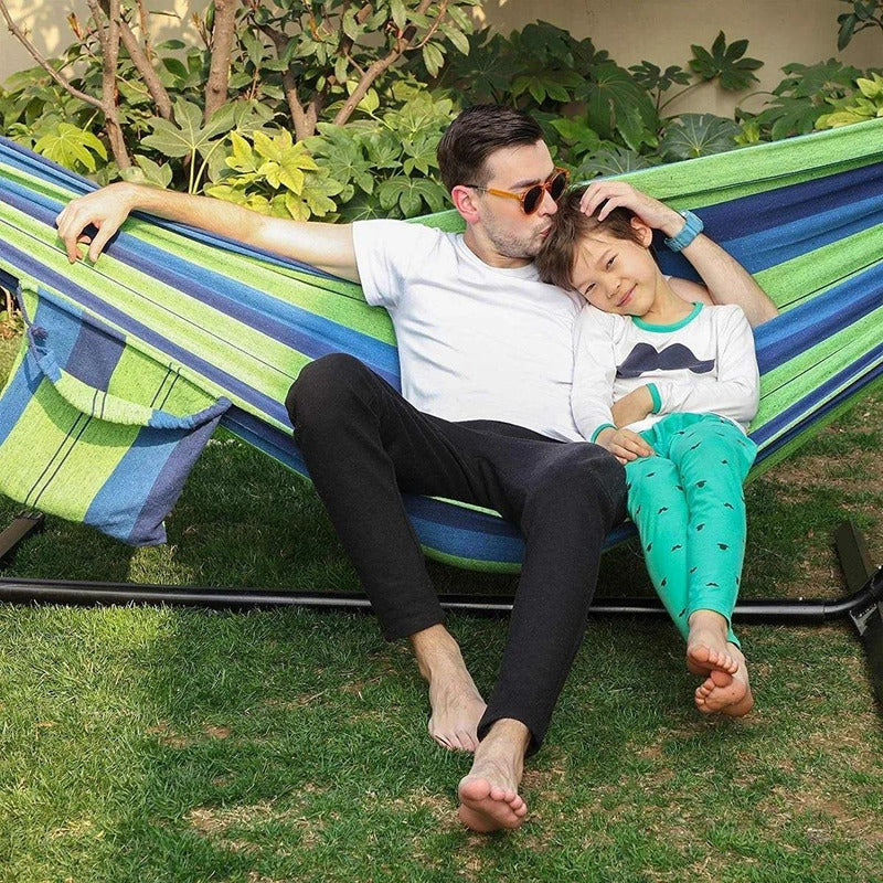 Esta silla ligera de hamaca es fácil de guardar y transportar.