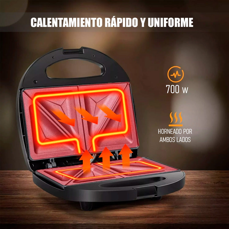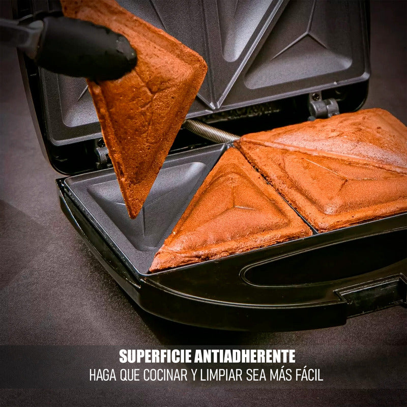 Tostadora Panini clásica de doble cara, se calienta rápida y uniformemente para un efecto perfecto, con revestimiento antiadherente que asegura que la comida no permanezca y súper fácil de limpiar.